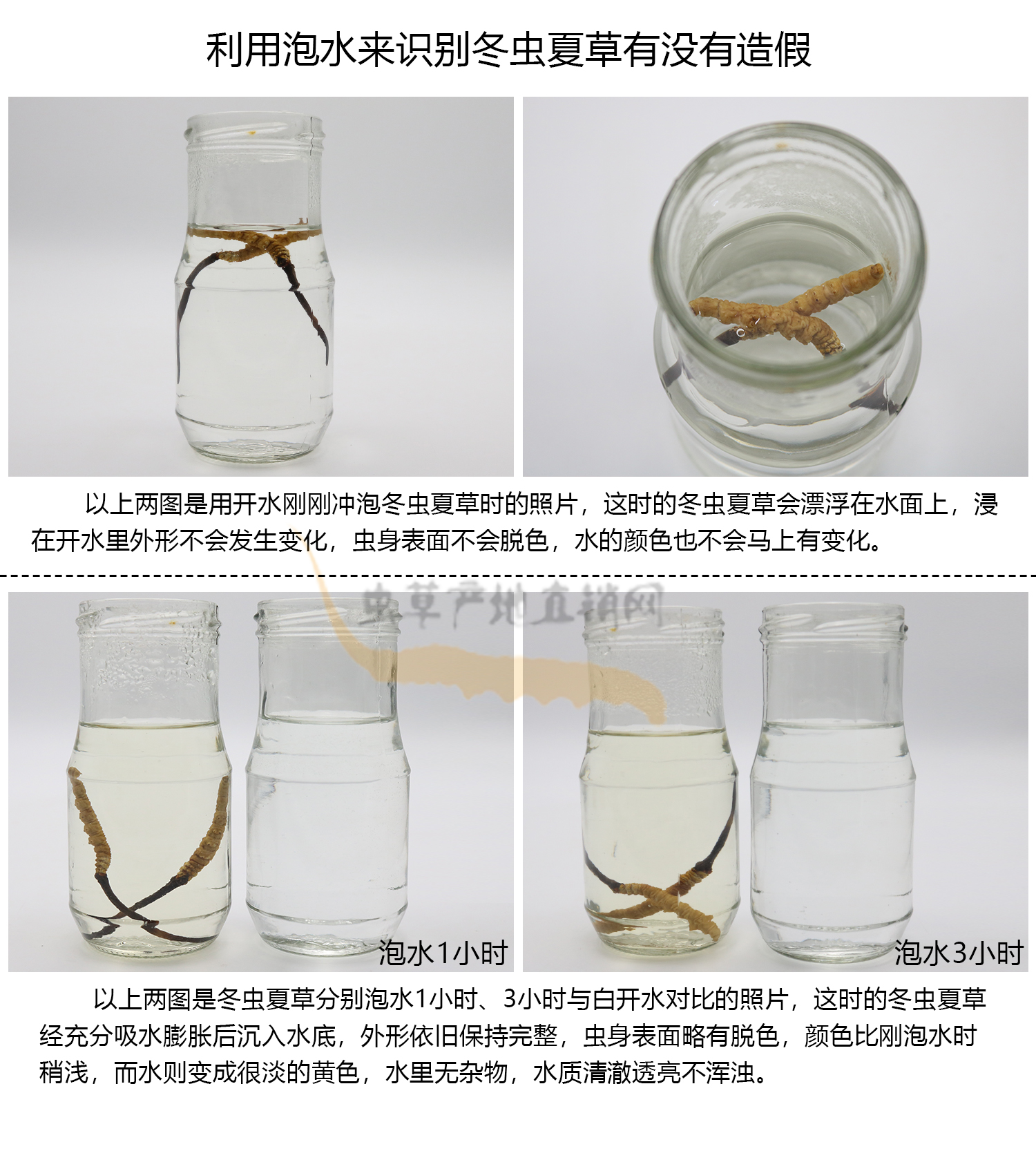 通過觀察上面的冬蟲夏草泡水圖片,我們從反向推理,可得出以下6個(gè)關(guān)于識別真假冬蟲夏草的結(jié)論: